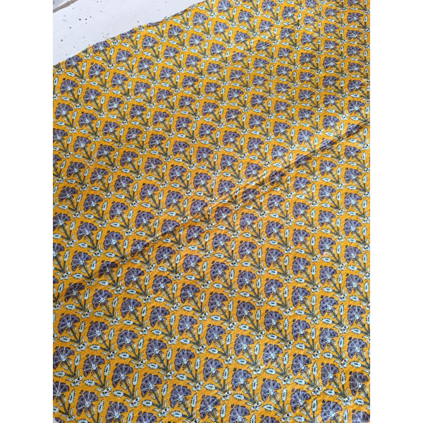 Tissu imprimé à la main en Inde selon la tradition du block print : un tampon de bois sculpté, trempé dans de la teinture puis appliqué sur le tissu tendu.