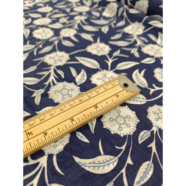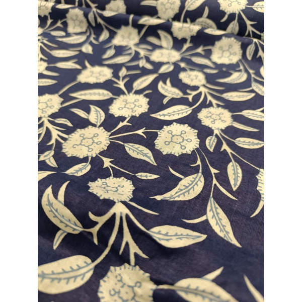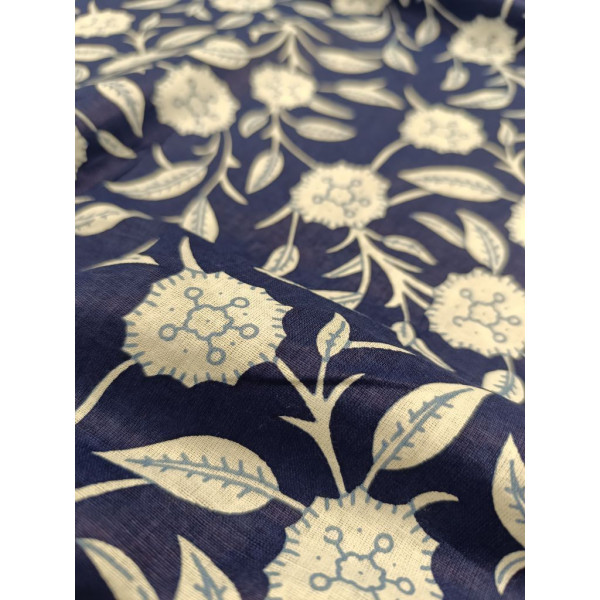 Tissu imprimé à la main en Inde selon la tradition du block print : un tampon de bois sculpté, trempé dans de la teinture puis appliqué sur le tissu tendu.