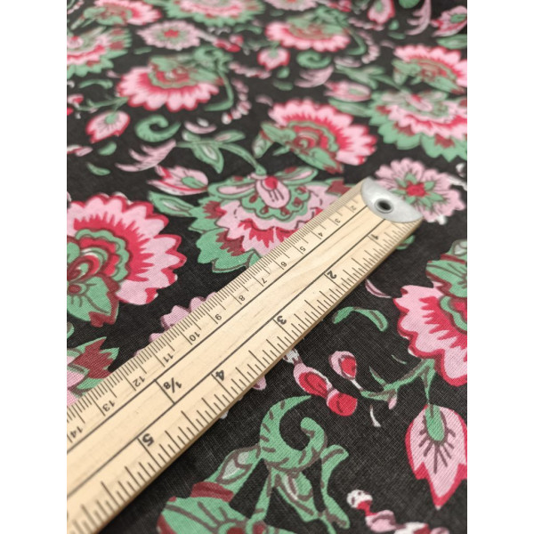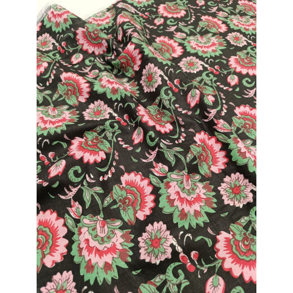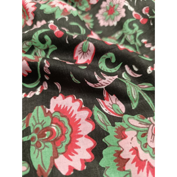 Tissu imprimé à la main en Inde selon la tradition du block print : un tampon de bois sculpté, trempé dans de la teinture puis appliqué sur le tissu tendu.