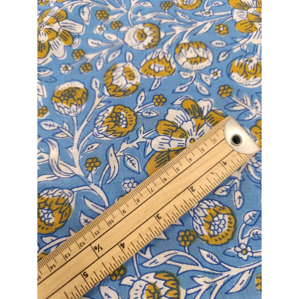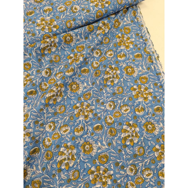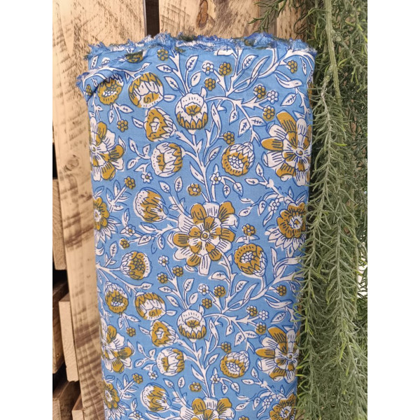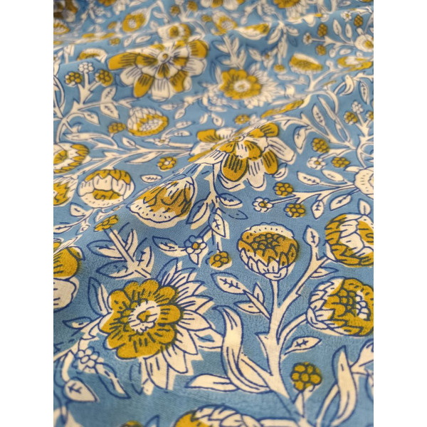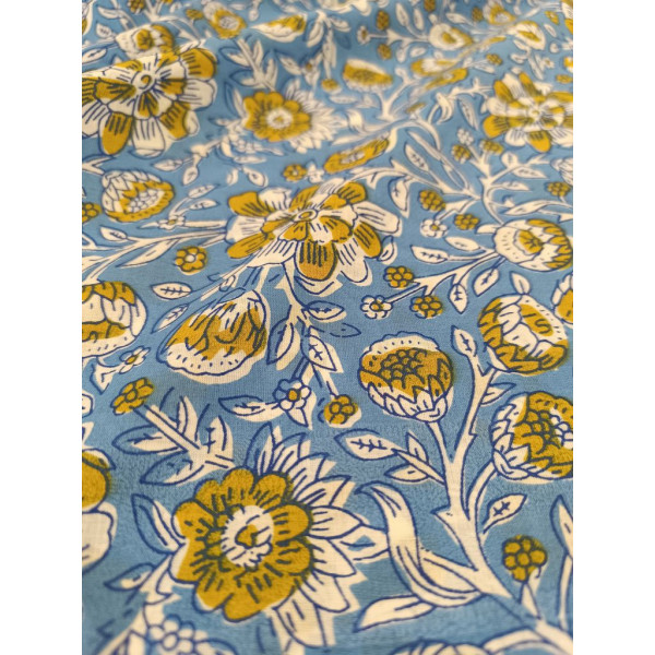 Tissu imprimé à la main en Inde selon la tradition du block print : un tampon de bois sculpté, trempé dans de la teinture puis appliqué sur le tissu tendu.