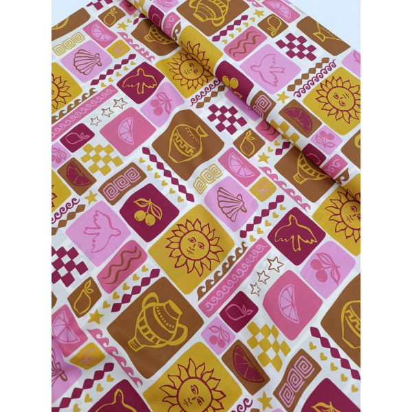 Couleur : fond écru / rose / jaune